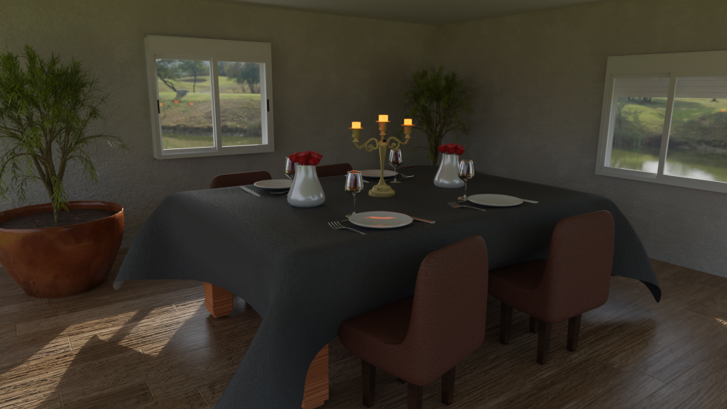 Pour apprendre l’utilisation du logiciel Blender et plusieurs de ces concepts (modificateurs, physique, …) nous devions modéliser une salle à manger réaliste.